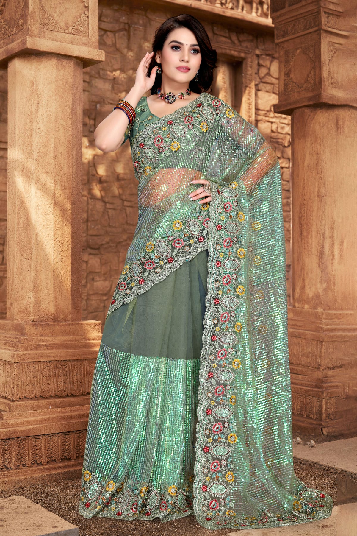 A Stylish Pista Green Colour Net Fabric Resham Work,Thread Work,Sequins Work,Embroidery Work Saree This Is An Absolute Designer Saree Designed For Every Occasion and Can Grace Any Body Type. The Stylish Pista Green Saree Is Partnered With An Alluring Blouse Which Can Be Stitched Up To Size 42.