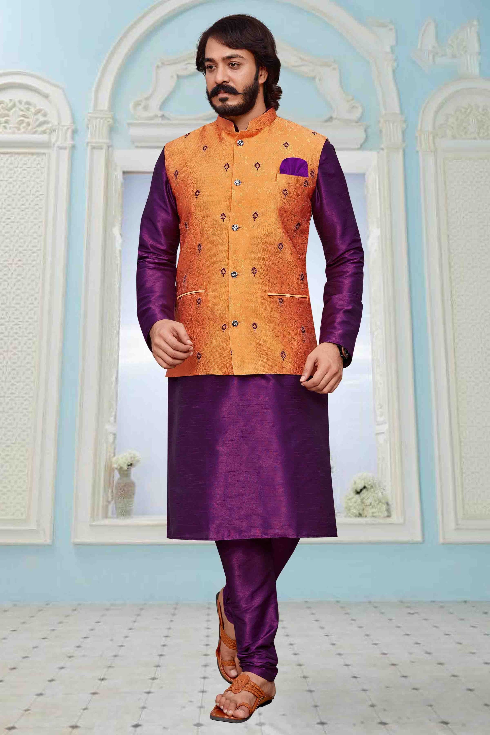 This Fancy Silk Kurta Pajama With Jacket In Purple Colour is a great way to show off your style and comfort. You can feel relaxed by wearing it at any function.