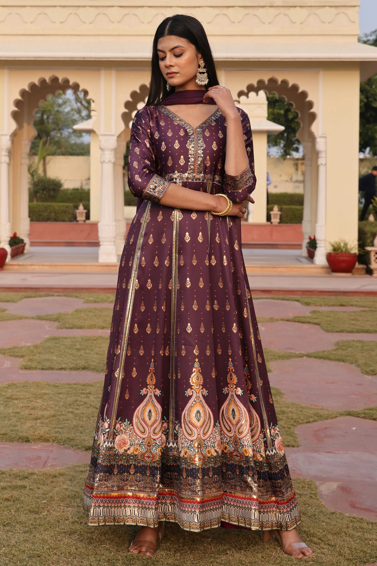 This Satin Anarkali Suit In Purple Colour is a great way to show off your style and comfort. You can feel relaxed by wearing it at any function.