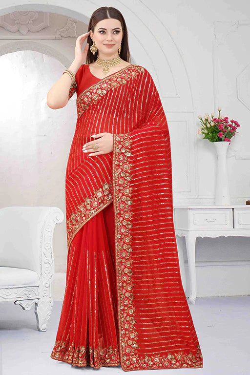 This Super Stylish Georgette Fabric Saree Is Exclusively Crafted With Resham Work,Zari Embroidery,Sequins Work. The Red Colour Saree Comes With Matching Blouse Fabric. This Saree Can Be Worn on Party Wear Occasion and Can Grace Any Body Type.Blouse Come as Unstitched Which Can Be Stitched Up to Size 42 inches.