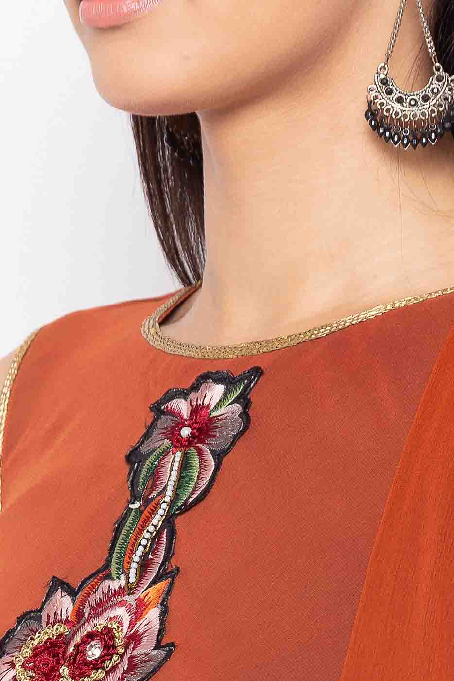 This Exclusive Pant Style Suit Is An Ultimate Party Wear Collection With The Mesmerizing Colours Of Rust With The Artistic Embroidery, Leave No Stone Unturned And Be At Your Fashionable Best. Georgette Stitched Kameez Comes With Matching Dupatta And Bottom.
