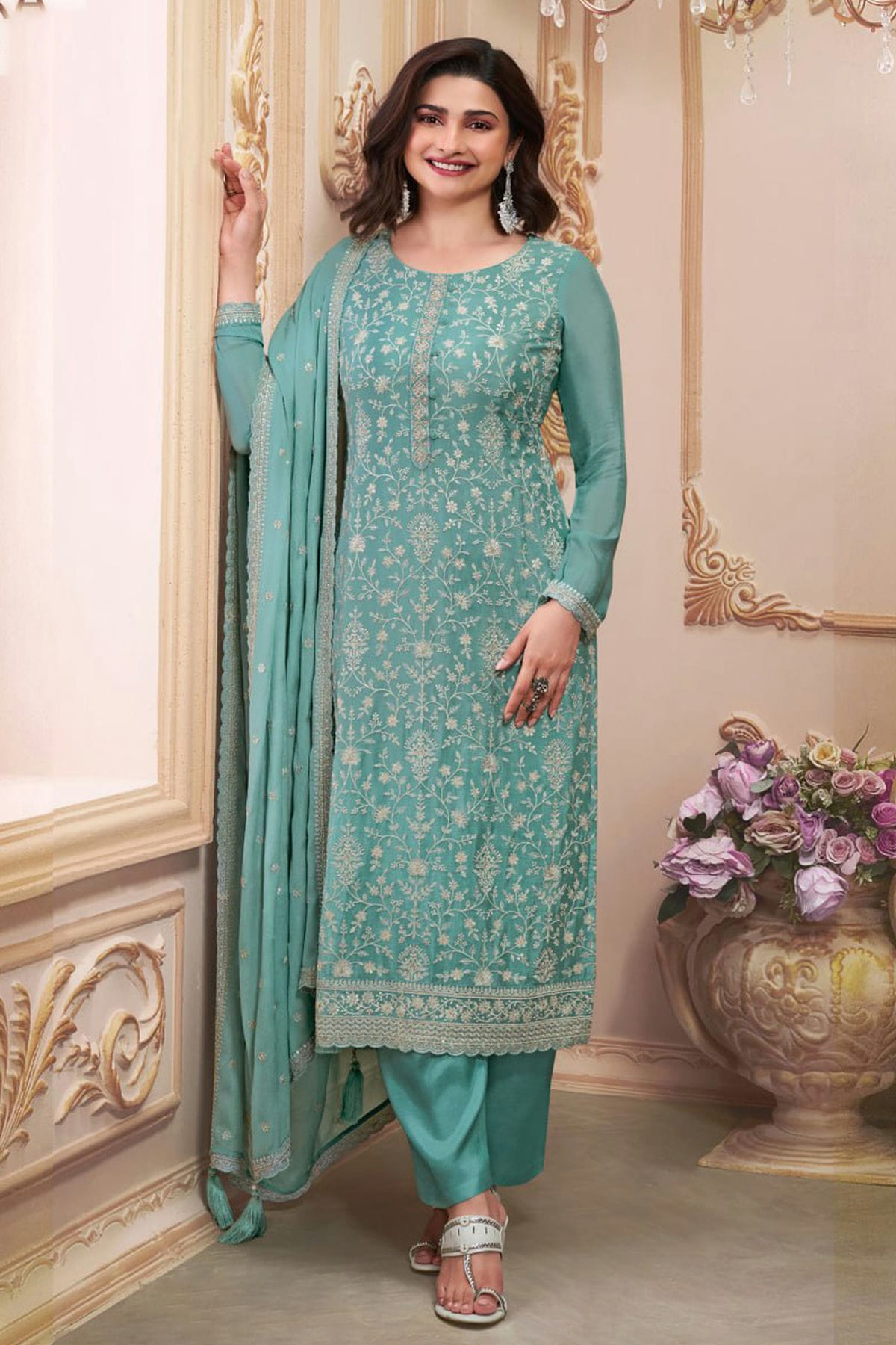 This Chinon Silk Pant Style Suit In Sea Green Colour is a great way to show off your style and comfort. You can feel relaxed by wearing it at any function.