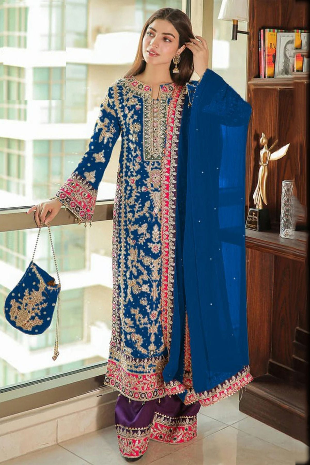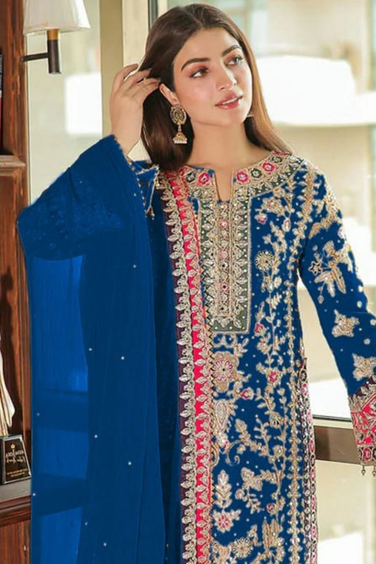 This Chinon Silk Pakistani Suit In Teal Colour is a great way to show off your style and comfort. You can feel relaxed by wearing it at any function.