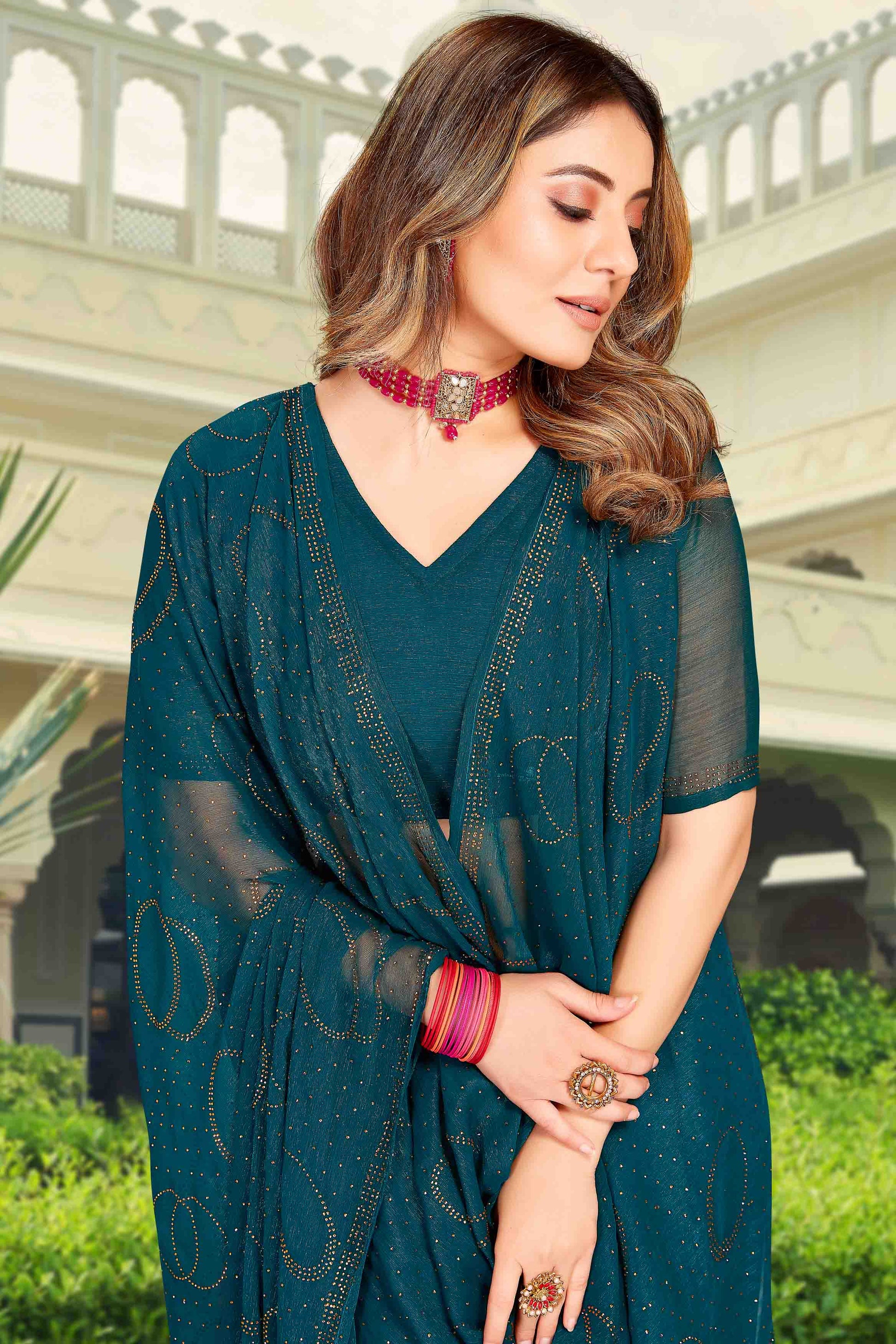 This Simmer Chiffon Saree In Teal Colour is a great way to show off your style and comfort. You can feel relaxed by wearing it at any function.