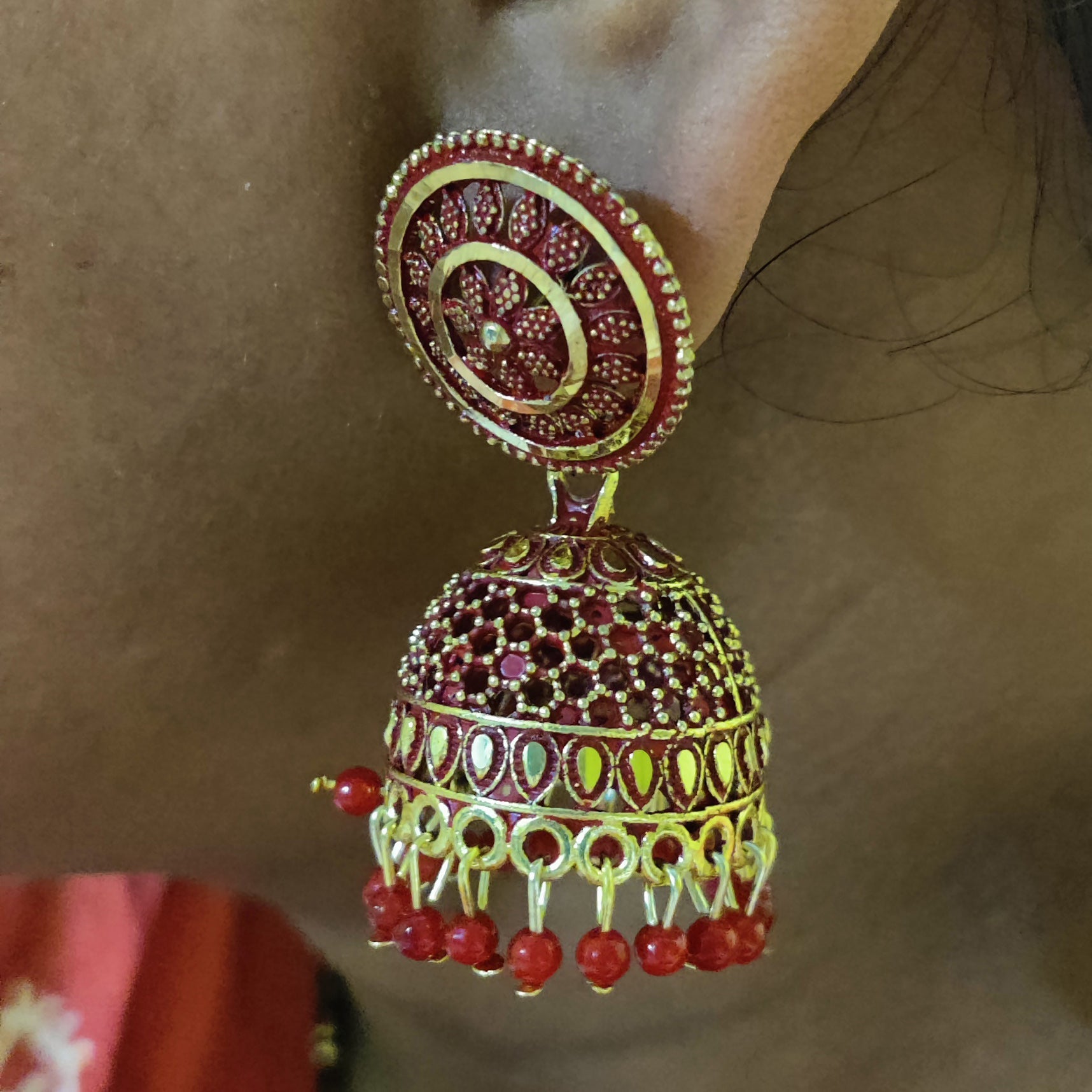 Vastradi Alloy Golden Traditional Jhumka in Red Colour