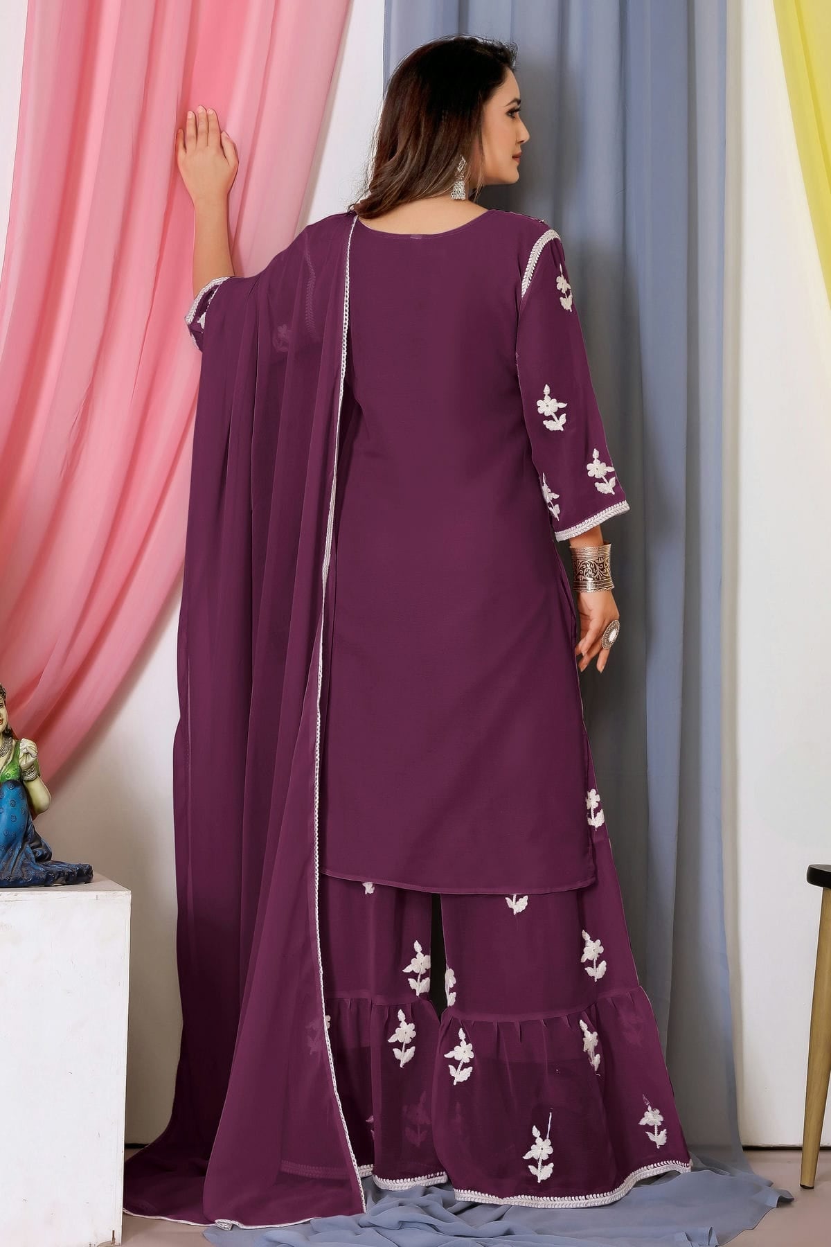 This Bamber Georgette Sharara Suit In Wine Colour is a great way to show off your style and comfort. You can feel relaxed by wearing it at any function.