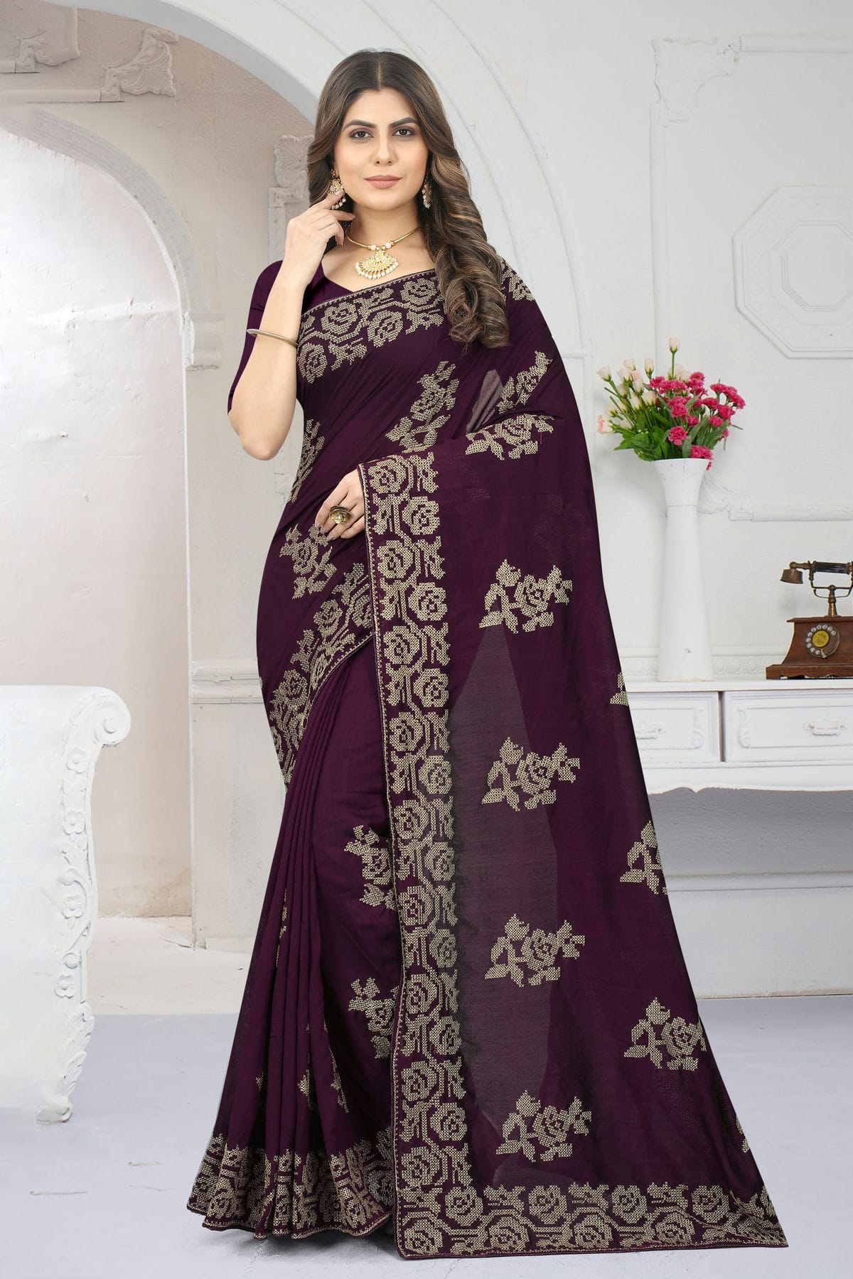 A Stylish Wine Colour Vichitra Silk Fabric Zari Work,Embroidery Work Saree This Is An Absolute Designer Saree Designed For Every Occasion and Can Grace Any Body Type. The Stylish Wine Saree Is Partnered With An Alluring Blouse Which Can Be Stitched Up To Size 42.